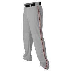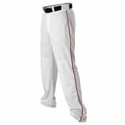 PANTS: – These are a hemmed, open-bottom pant. – 100% warp knit 14oz polyester – Relaxed fit, wide leg, open-bottom, non-traditional pant – Single row, contrast colored 3/16 inch soutache sewn down both sides of pants – Two double welt, set-in back pockets with contrast color welts to match braid going down sides – Double knee construction – Seven pro-style belt loops – Brass zipper fly, two snap closure – Heavyweight extra comfort 2.5 inch elastic waistband – Cover seamed throughout for appearance and reinforcement – Hemmed leg bottoms – Adult ankle length inseams in inches: S (31), M (32), L (33), XL (34), 2XL (35), 3XL (36) – Youth ankle length inseams in inches: S (24), M (25.5), L (27), XL (28.5) SIZE YOUR PLAYERS Click here to view sock options Click here to view cap options