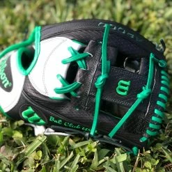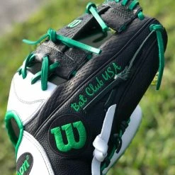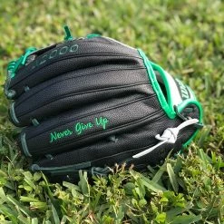 Take home this custom A2000 designed by Bat Club USA. With Black Snake Skin, Dark Green accents and a white palm, this glove is sure to stand out in a crowd. With the words “Never Give Up” inscribed on each glove, this glove will help you push past the competition.